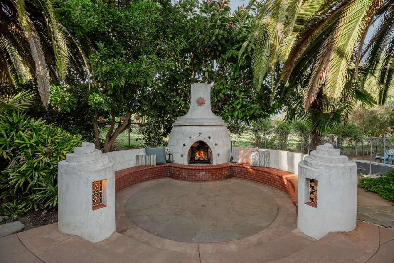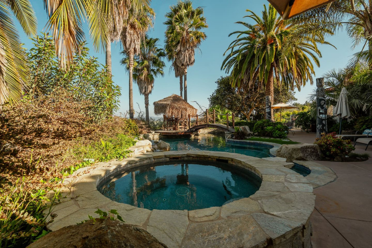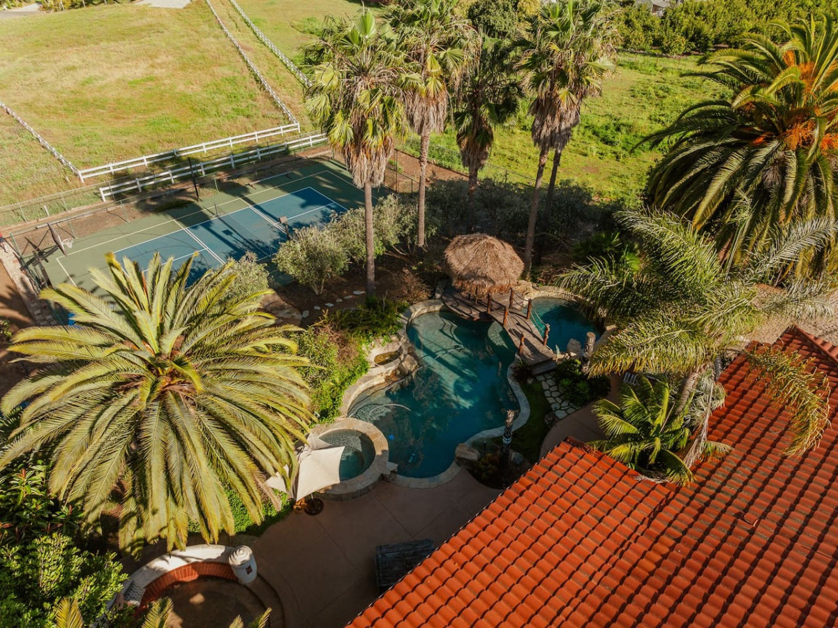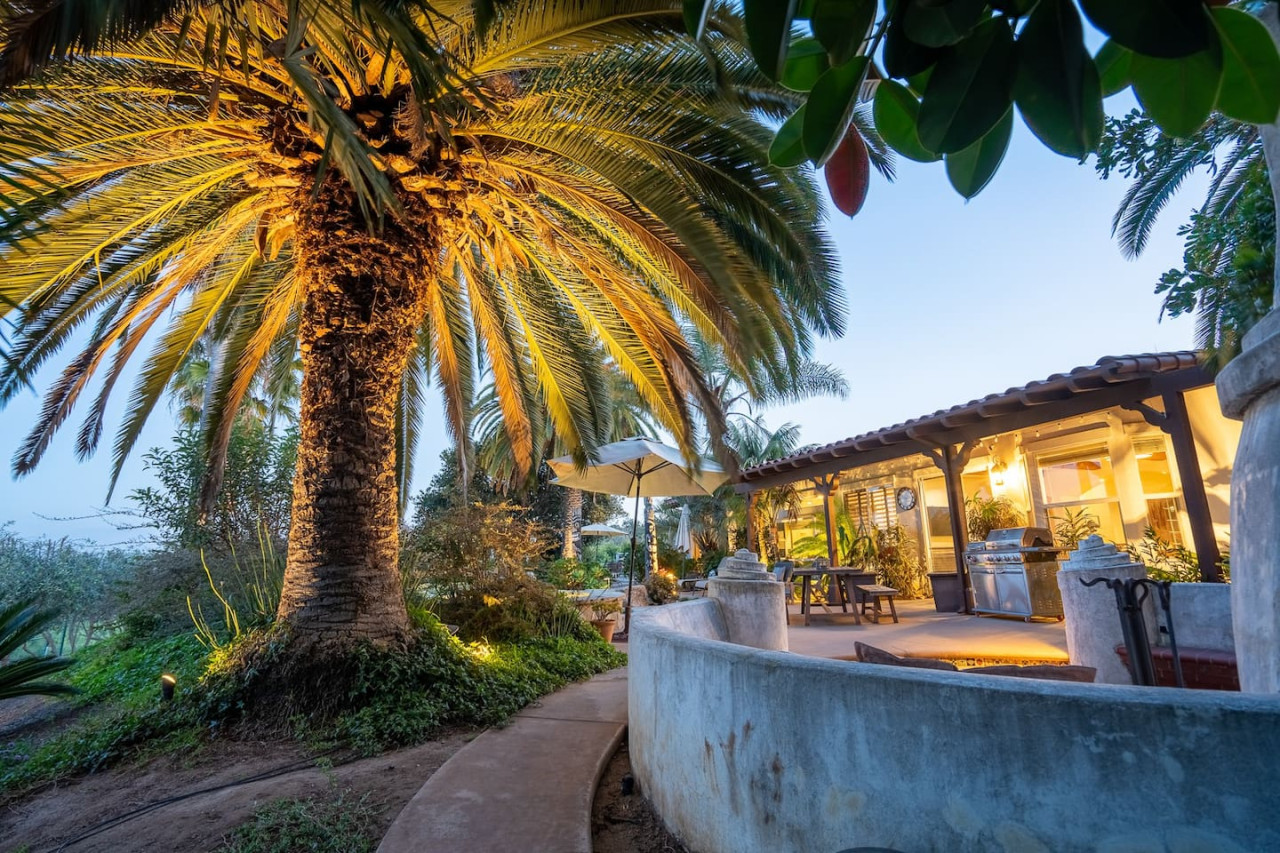 / nightA recreational paradise, this Spanish beauty resides on a private 1 acre parcel with countless outdoor amenities including tropical pool, sunken outdoor fireplace, pizza oven, vineyard, and a pickle ball/tennis/basketball lighted court. A serene location for families, relaxation, and small gatherings, this entire home includes a gourmet kitchen with Ilve stove, wood burning pizza oven, chilled wine storage, and well-equipped kitchen. Come, unwind, and enjoy beautiful views of scenic Fallbrook. Friendly, family-oriented neighborhood. 2-mile equestrian trail right in your back door. Tons of wildlife and no street traffic. Tons of open space.