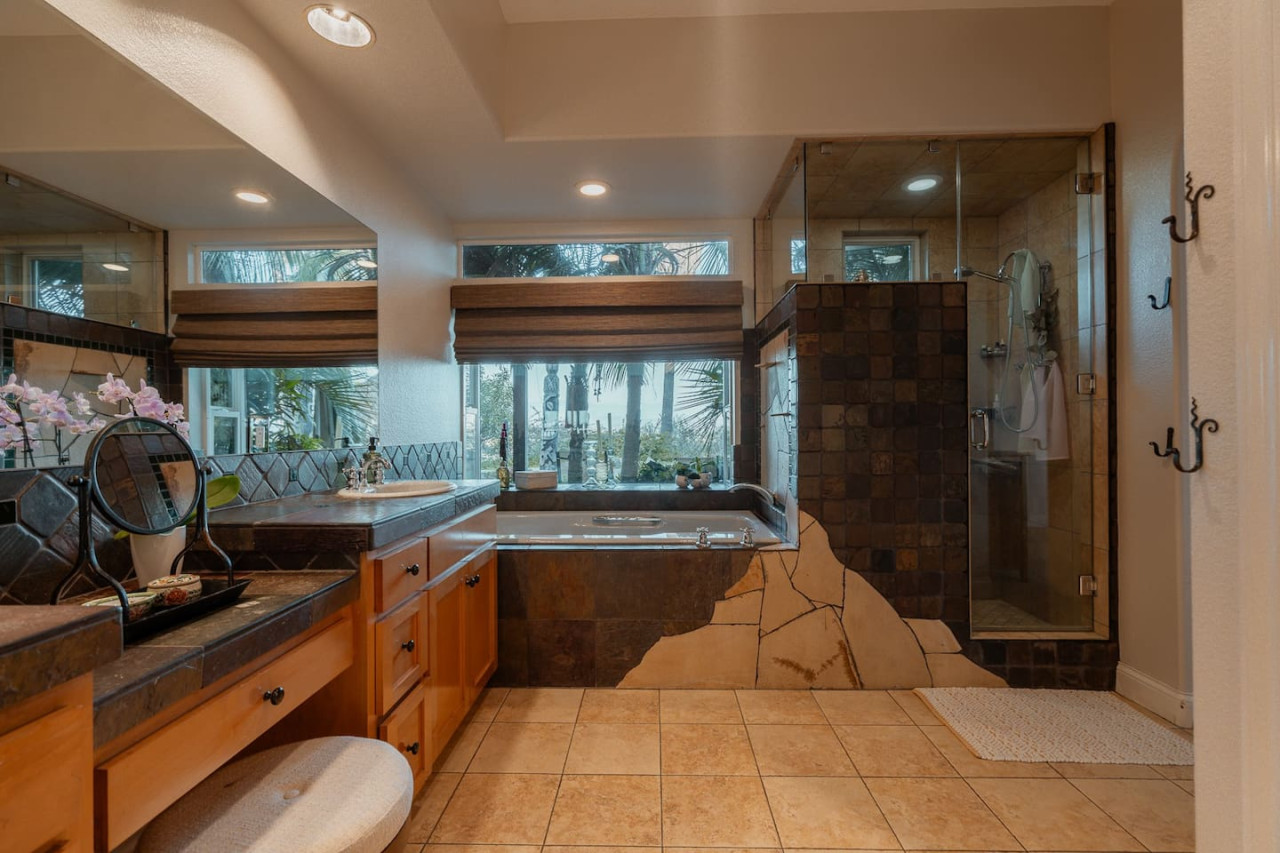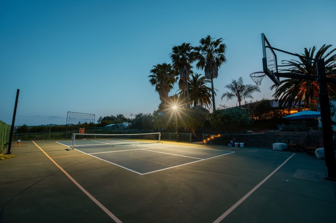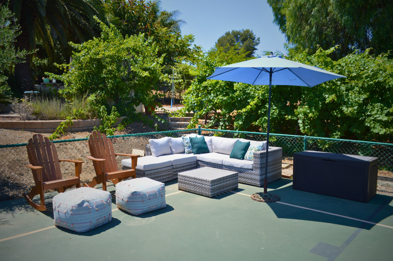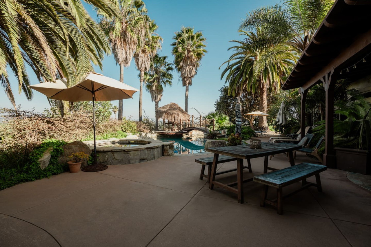 / nightA recreational paradise, this Spanish beauty resides on a private 1 acre parcel with countless outdoor amenities including tropical pool, sunken outdoor fireplace, pizza oven, vineyard, and a pickle ball/tennis/basketball lighted court. A serene location for families, relaxation, and small gatherings, this entire home includes a gourmet kitchen with Ilve stove, wood burning pizza oven, chilled wine storage, and well-equipped kitchen. Come, unwind, and enjoy beautiful views of scenic Fallbrook. Friendly, family-oriented neighborhood. 2-mile equestrian trail right in your back door. Tons of wildlife and no street traffic. Tons of open space.